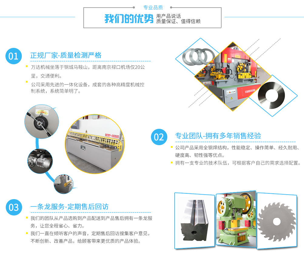 馬鞍山萬達機械科技有限公司是在新形勢下投資新建的高新技術企業,成立于2013年,專業生產銷售各類折彎機,剪板機、卷板機、沖壓機、鱷魚式剪切機,金屬液壓打包機,液壓聯合沖剪機,數控刀模具等。經營過程中采取先進管理模式,引進先進的技術,在產品質量上不斷向更高層次邁進。在人力資源開發中,堅持“以人為本”的管理理念,專業為航空、輕工、冶金、化工、建筑、汽車、電力、裝潢等行業提供所需要的專用機械和成套設備。   本公司經營主導產品有:液壓折彎機、剪板機、卷板機、沖床,鱷魚式剪切機,金屬液壓打包機;剪板機刀片、折彎機模具、圓刀片、攪拌機合金耐磨等機械成套設備和配件。對于客戶特殊要求的非標準產品,也是我們技術開發計劃中深化改革的一項重大舉措。讓每一個客戶滿意,才能真正實現國際化,集團化的營銷市場。通過經營過程中不斷追求...